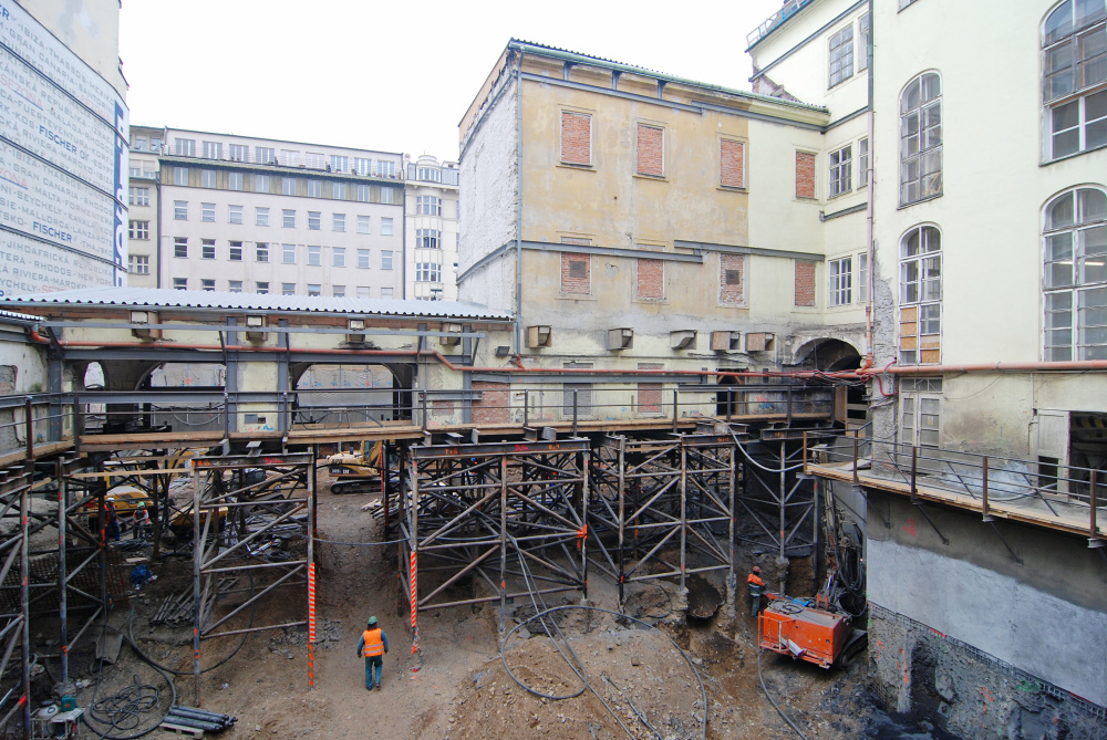 Provedení prací bylo náročné kvůli velmi stísněnému pracovišti, souběhu bouracích a přípravných prací a také kvůli zajištění plynulého zásobování staveniště v historickém centru Prahy a následným odvozem vyplaveného materiálu, především v dopravních špičkách, neboť na stavbě nebyl dostatek místa, který by umožnil vytvořit jímku pro vyplavený materiál, resp. zde byl zákaz výkopů přes danou kótu, která byla určena pro provádění archeologických prací. Díky rozsáhlému souboru opatření a technologií uplatněných při zapažení této hluboké stavební jámy a při podchycení původních konstrukcí se jednalo o mimořádné a technicky pozoruhodné dílo.
