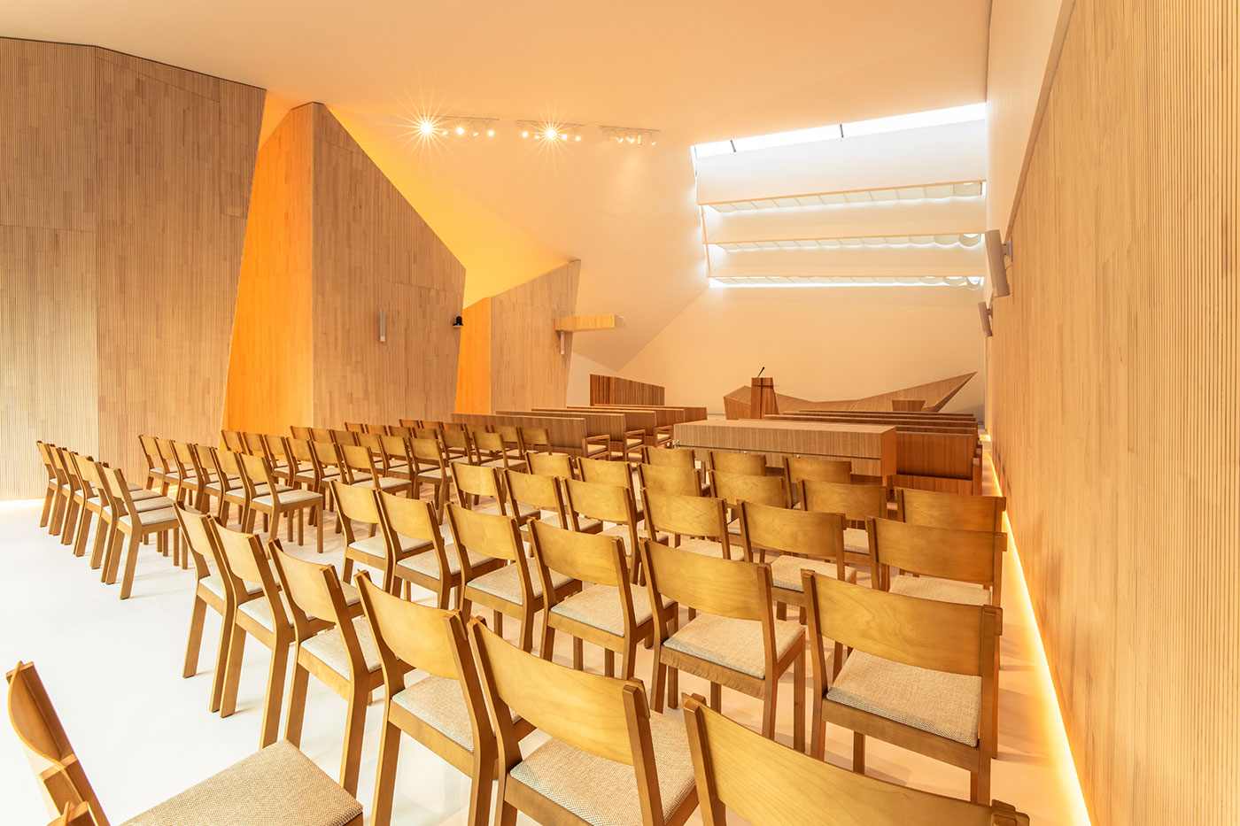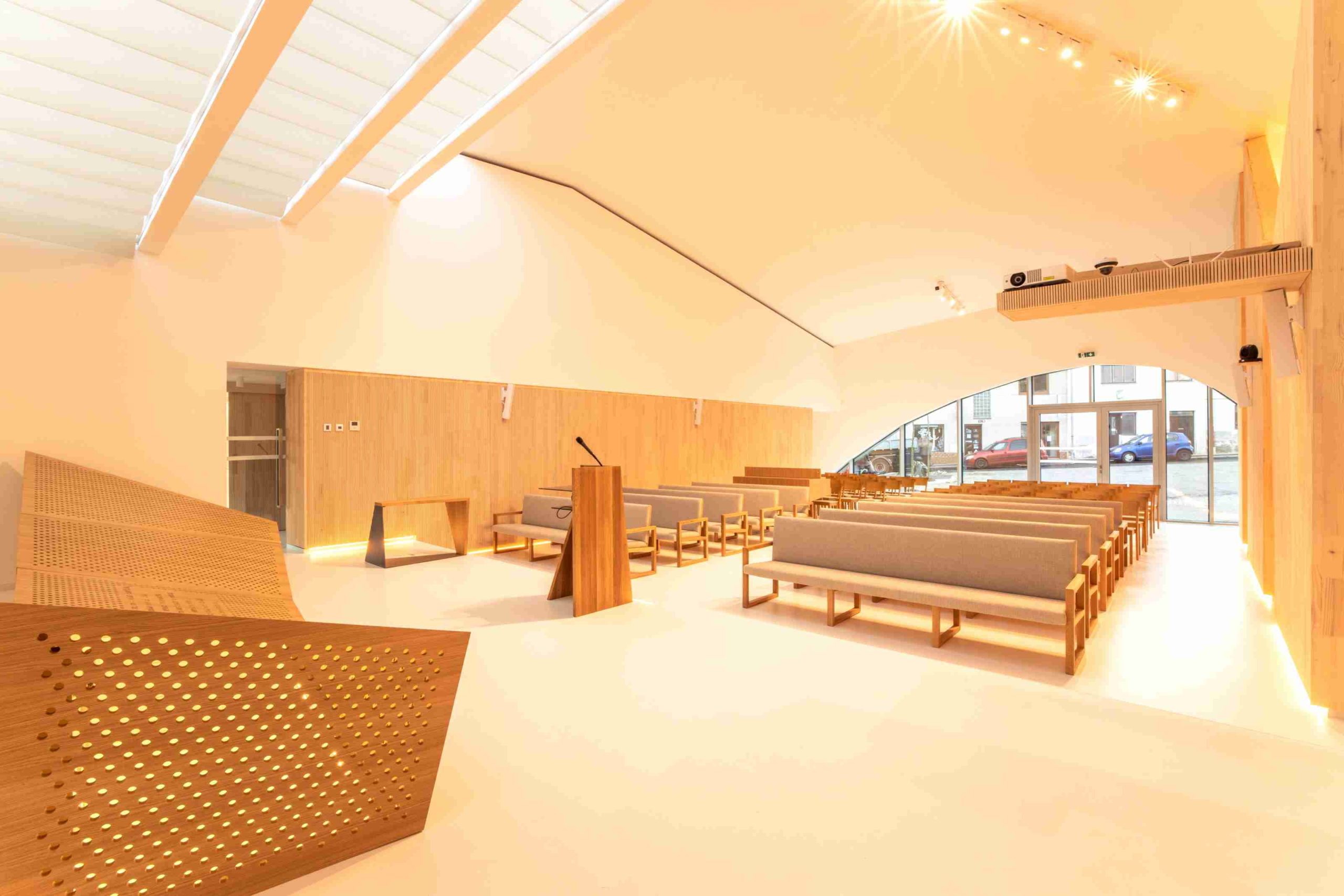 Kadlecové, nad níž graduje strop hlavního sálu. V levé části sálu se nachází boční kaple pro intimnější liturgii. Naopak velkoryse pojednaný ceremoniální vstup v zadní části hlavního sálu vyjadřuje otevřenost prostoru. Atmosféra modlitebny je umocněna zvolenými materiály. Kombinace bílých ploch podlahy, stěn a stropu se světlým dřevem interiéru je v příkrém kontrastu s vnějším vzhledem. Dobrá akustika hlavního sálu je zajištěna dřevěným obkladem, který v sobě ukrývá několik vrstev pohlcujících zvukové vlny. Pod akustickým obkladem jsou umístěny technologie vzduchotechniky a chlazení.