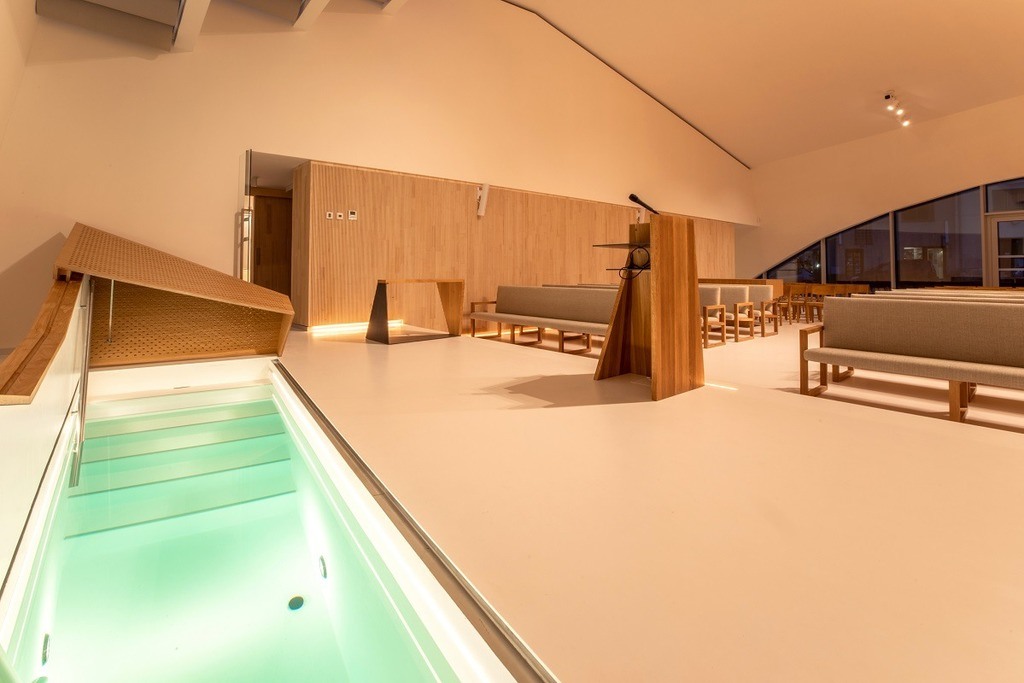 Interiérovou dominantou, resp. srdcem celé modlitebny je křtitelnice pro křest ponořením od sochařky Jaroslavy